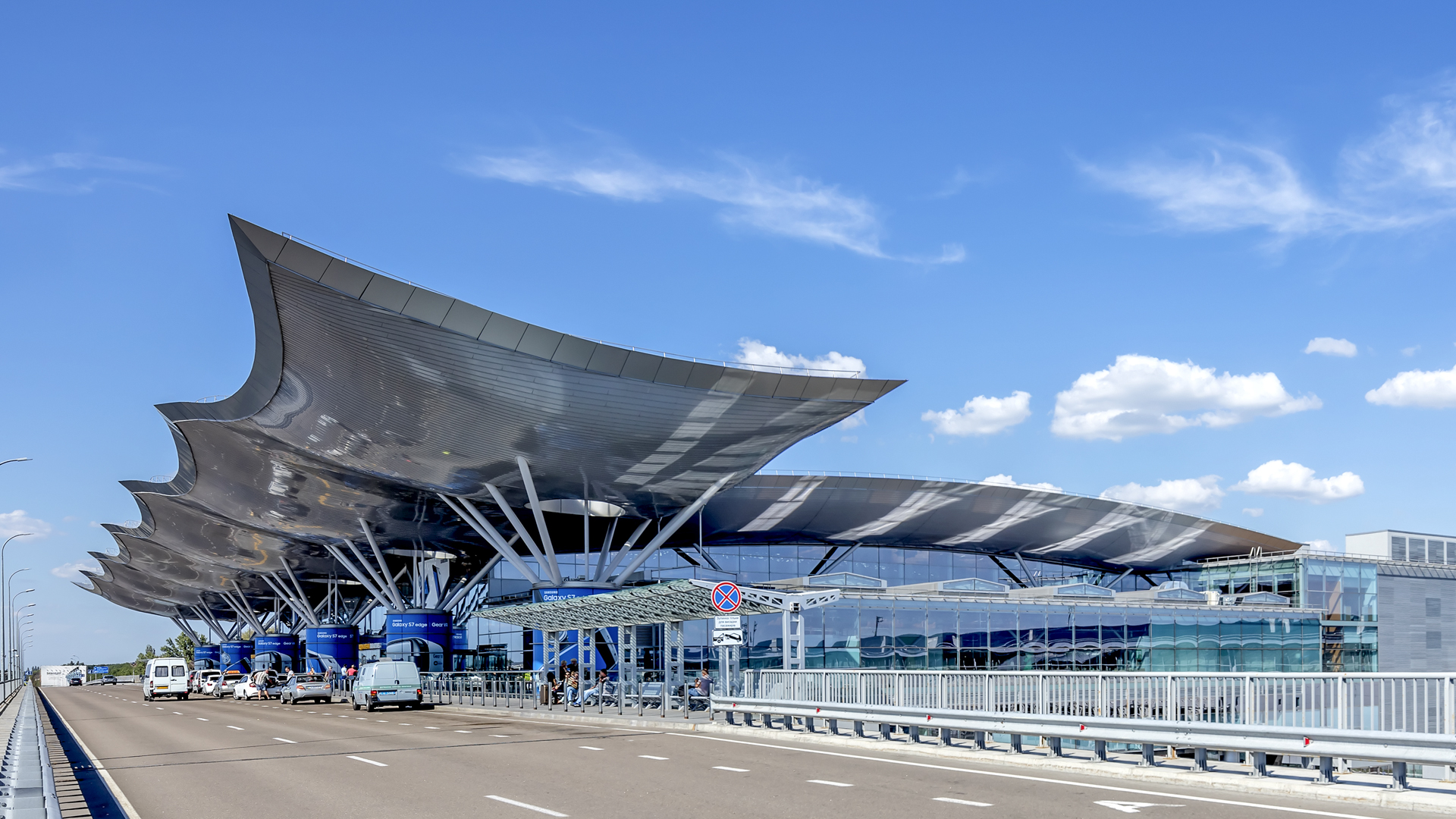Organic shaped aluminum soffit cladding which welcomes the passengers.
